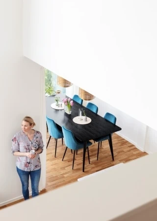 ‑Det bästa med vårat hus är den dubbla takhöjden och ljuset som ger en skön rymd, säger Malin Tilja, när vi besöker dem i deras nybyggda parhus i BRF Skvadronhöjden i Vallentuna. Den moderna träfasaden smälter väl in i den omgivande naturens färgpalett. Placeringen är väl konstruerad vid berget i den orörda naturen och ligger bara ett stenkast från Vallentunasjön.